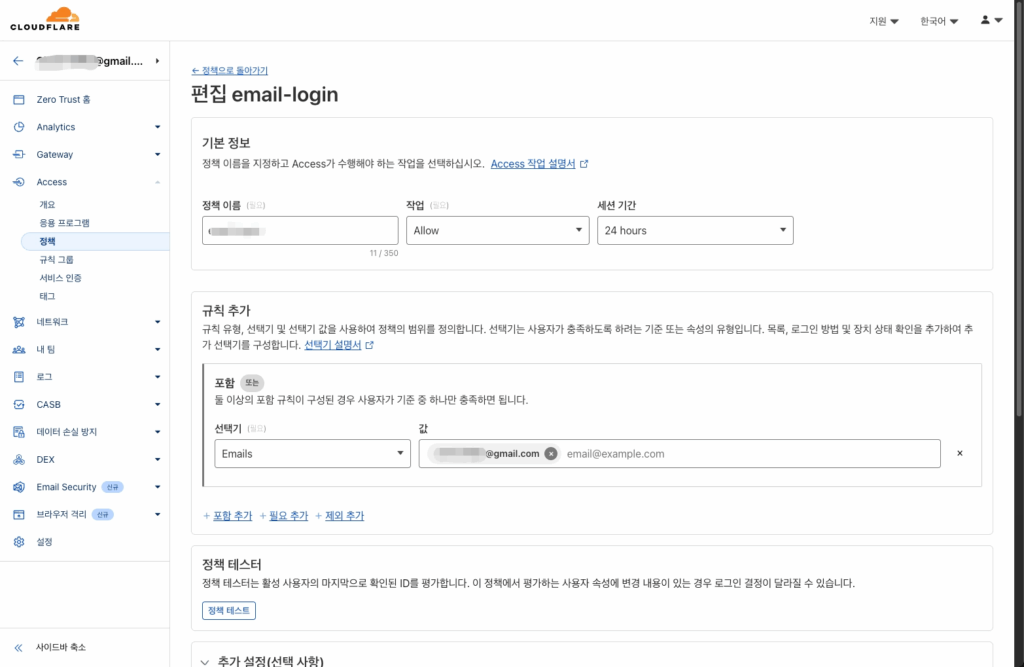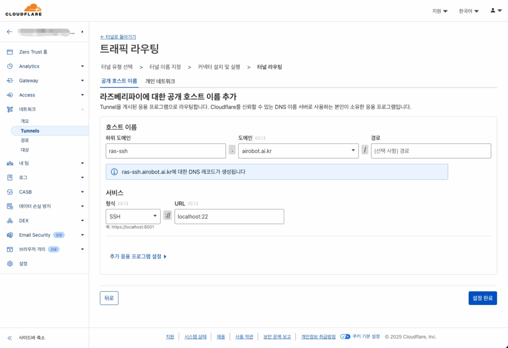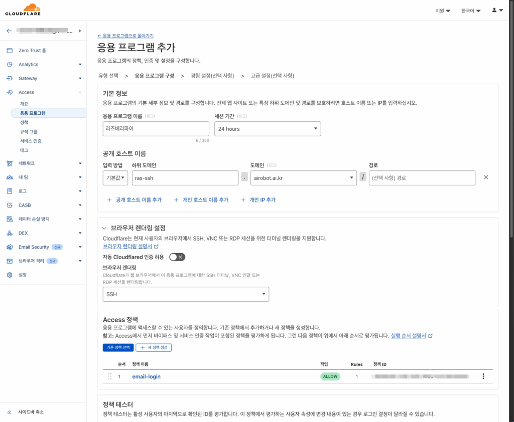 자체 호스팅 메뉴 선택 -> 도메인은 위에서 공개한 도메인 입력 -> 브라우저 렌더링 SSH 설정 -> 정책 선택